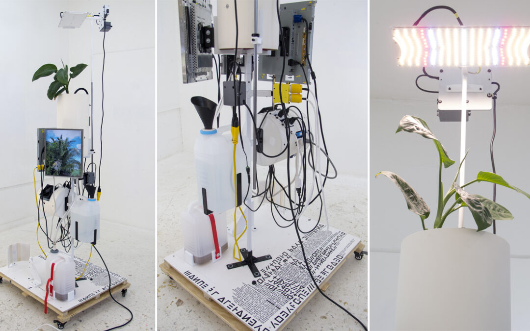 Image: Manuel Alejandro Rodríguez-Delgado, Estudio para Combina Orbital #4 ‘ECO-4’ (Study for Orbital Combine #4, SOC-4), 2024. Flood irrigation pipe, steel, aluminum, vinyl hosing, Rábano Cimarrón plant gathered from the Puerto Rican rainforest, plywood, Douglas fir, steel hardware, various repurposed electronics, LED grow light, LCD screens, single-channel video on a loop, various repurposed plastics and rubber, cat litter containers repurposed as water tanks. 104 x 31 x 39 inches. Image courtesy of the artist.